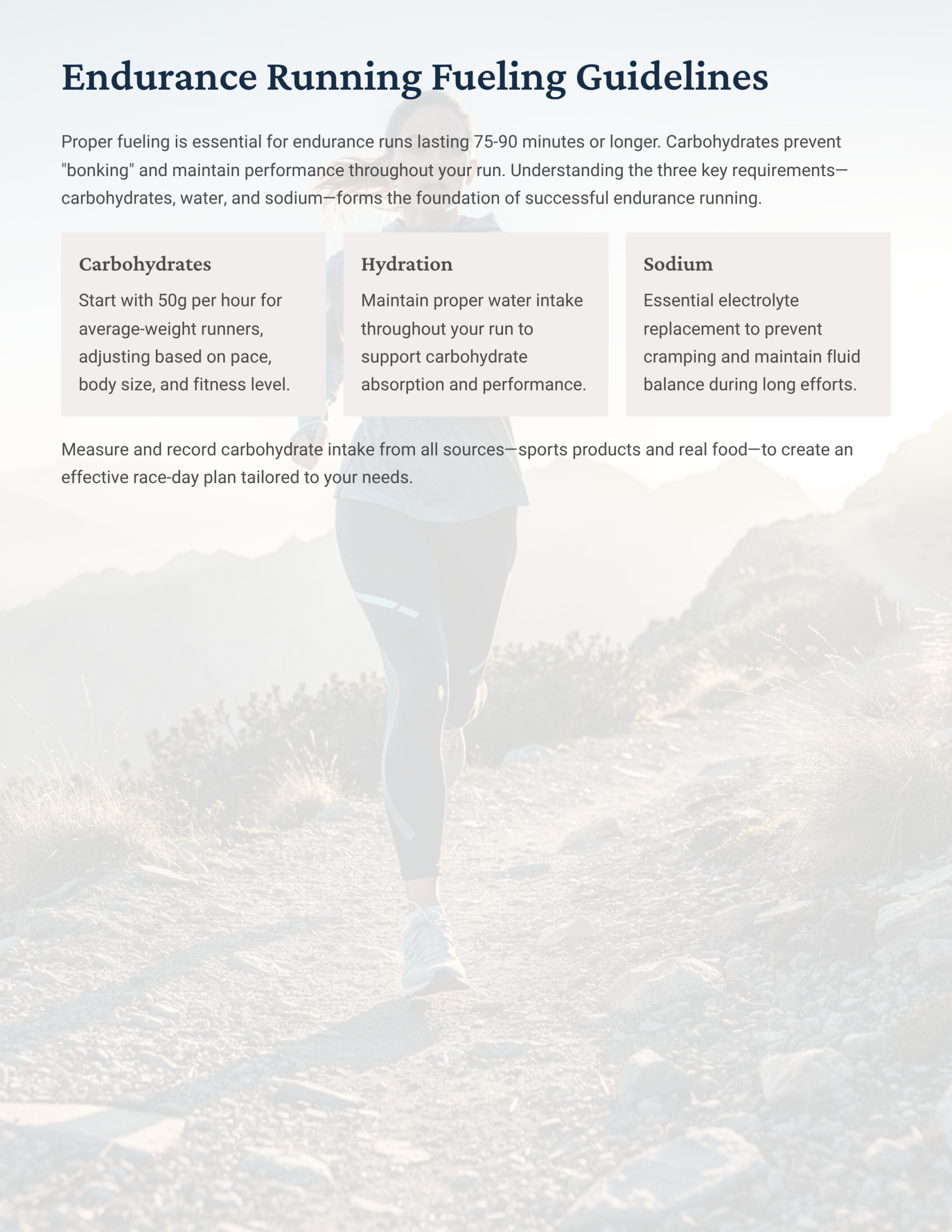Race Nutrition Planning Guidelines Carbohydrates 50-70g per hour for endurance runs Hydration 500-800ml per hour based on sweat rate -some people will need even more if its very hot Sodium 400-600mg per hour for races over 3-4 hours Tamara provides…