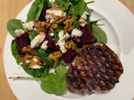 This is such a simple and yummy salad – a regular in our repertoire of meals. Perfect for a mid week meal with a steak. What you need: 1 Roasted Beetroot per person English spinach leaves Roasted Walnuts Goats Cheese…